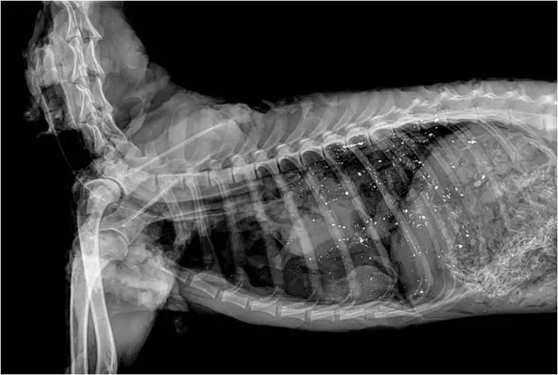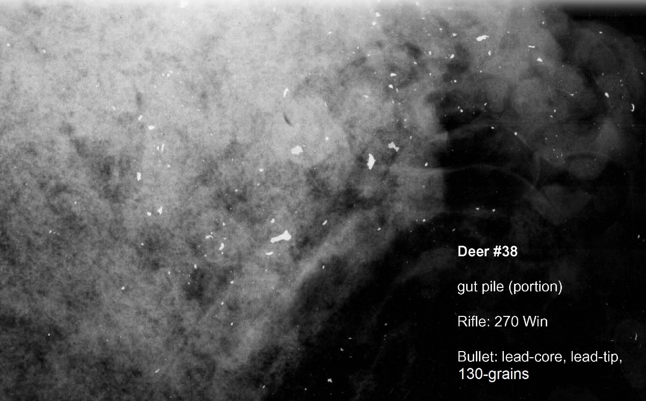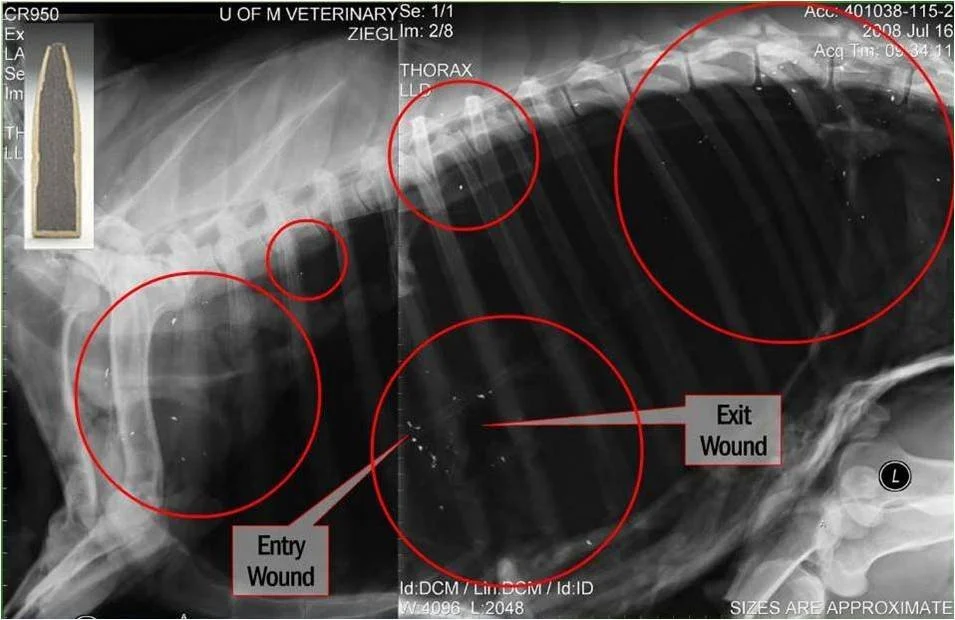 X-rays of an animal shot with a lead bullet show widespread fragmentation — dozens of tiny lead particles scattered throughout the body cavity, far beyond the wound channel.
