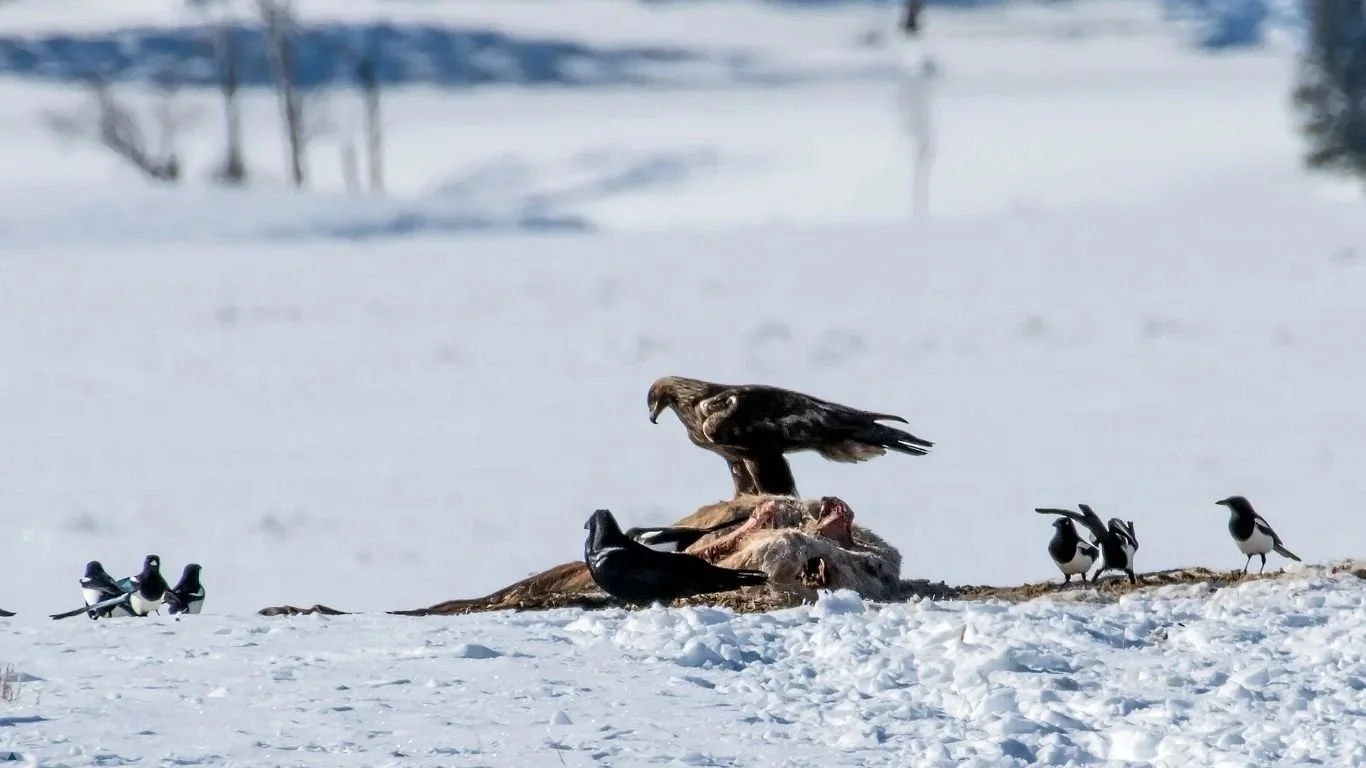 After field dressing, the remains left behind, commonly called gut piles, become an important food source for scavenging wildlife. Eagles, hawks, ravens, coyotes, and other animals rely on these remains, especially during hunting season when other food is scarce.